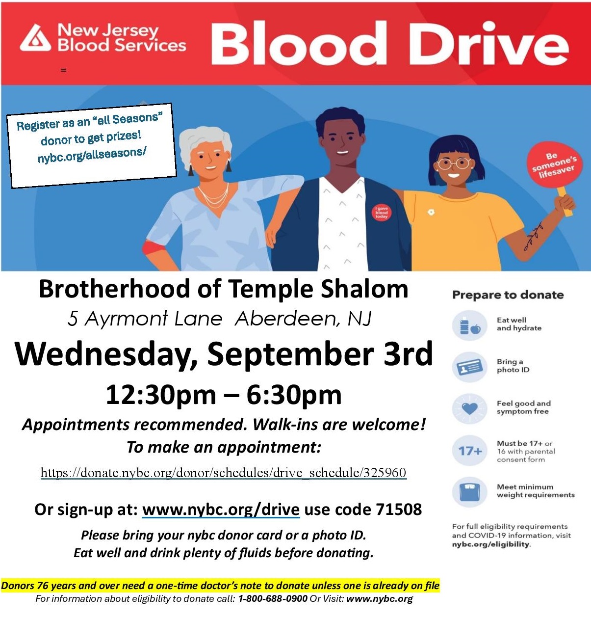 NOTE: Members of the Social Action Committee will be in the Temple parking lot that day, from 4:30 – 6:00 PM, accepting collections for the School Supply Drive that they are sponsoring. Please consider dropping off some donations for the School Supply Drive while you’re there for the Blood Drive.